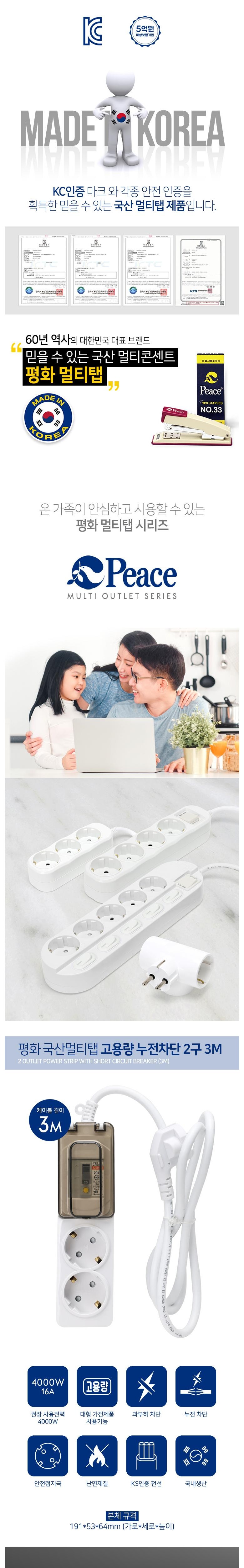 HOME > 인테리어/공구/DIY > 전기용품 > 멀티탭 > 평화 고용량 누전차단 2구 1.5m/3m