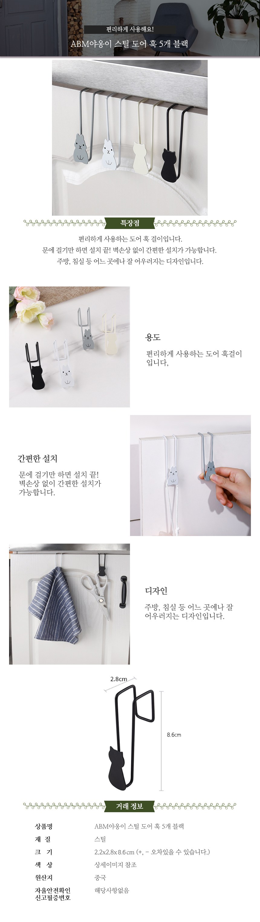 ABM 야옹이 스틸 도어훅 5개 색상랜덤_